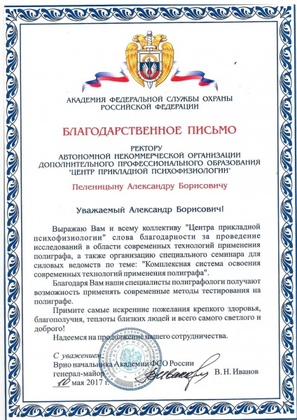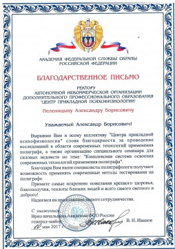 - Удостоверение о повышении квалификации АНО ДПО «ЦПП» в рамках 11-го Ежегодного семинара полиграфологов по программе: « современные технологии применения полиграфа» 18-20 января 2017г., №798.
