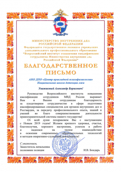 - Сертификат участника 19 международной научно-практической конференции «Современная практика и перспективы использования специальных психофизиологических исследований в борьбе с преступностью и работе с кадрами» 10-12 октября 2018 г.