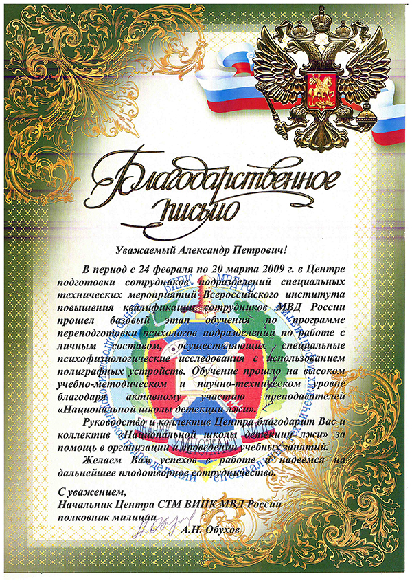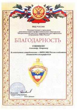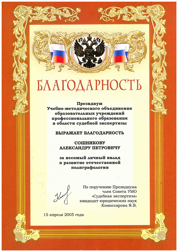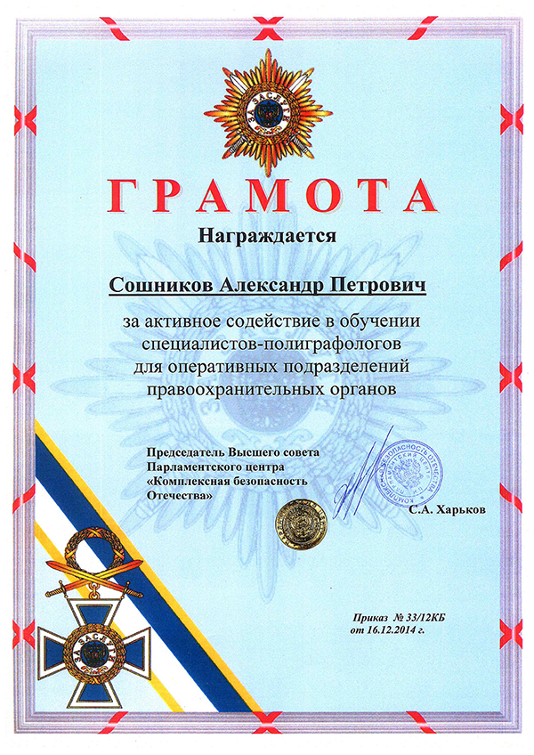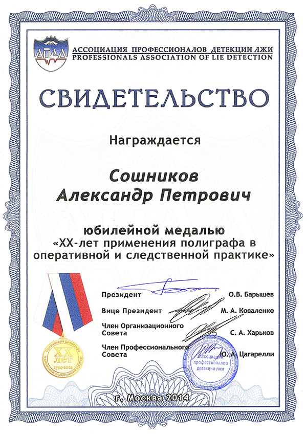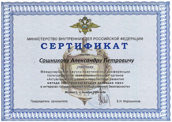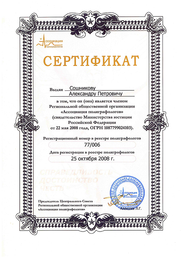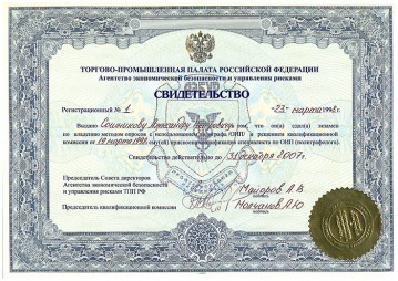 - Свидетельство Торгово-промышленной палаты Российской Федерации о присвоении квалификации специалиста по ОИП (Полиграфолога) №1 от 31.12.2007г.