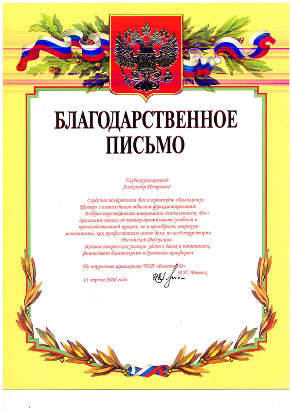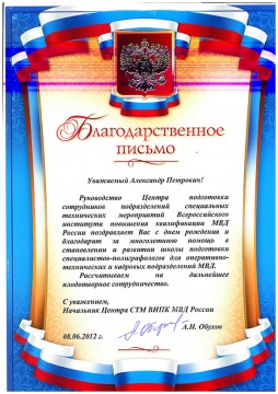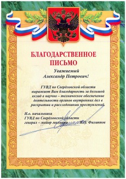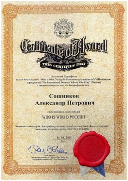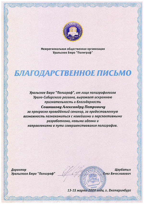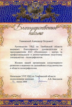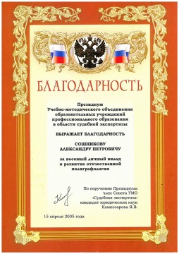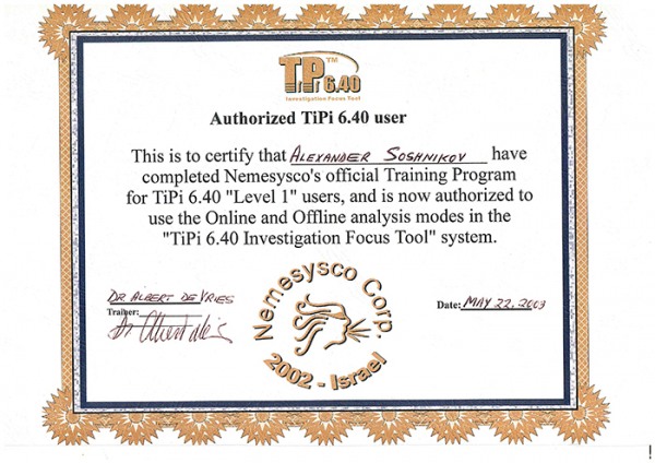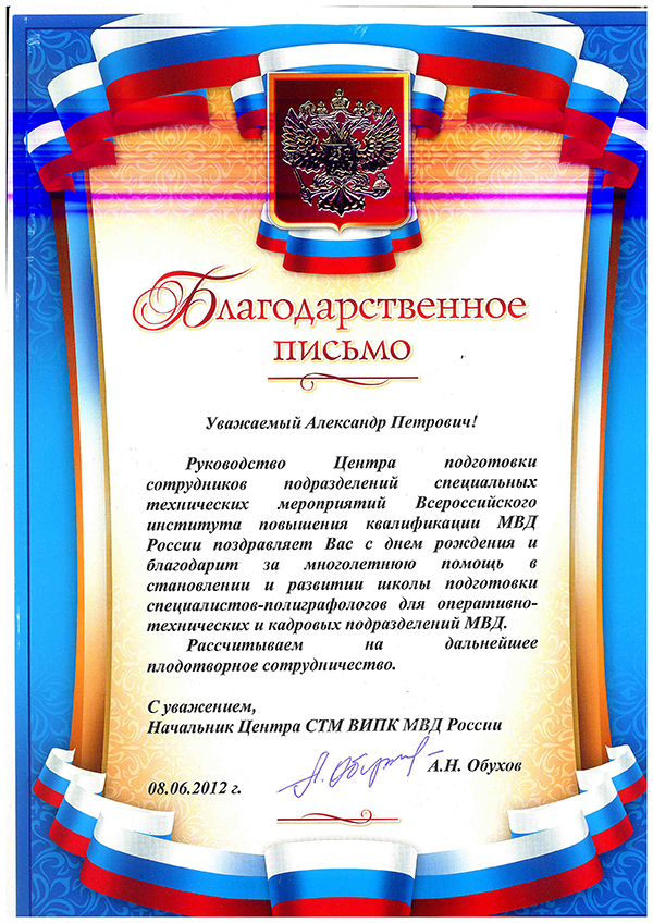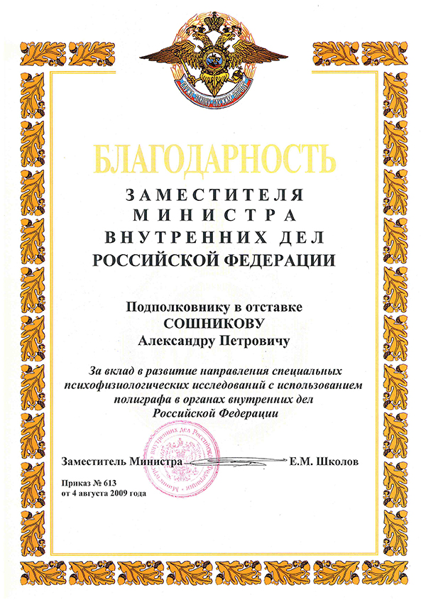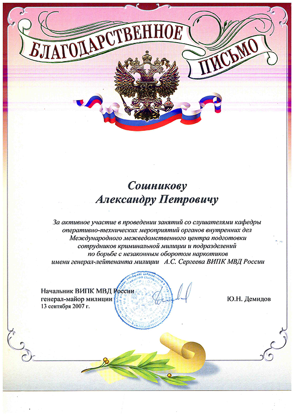 - Свидетельство Торгово-промышленной палаты Российской Федерации о присвоении квалификации специалиста по ОИП (Полиграфолога) №1 от 31.12.2007г.