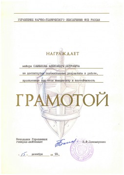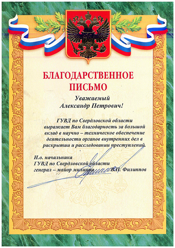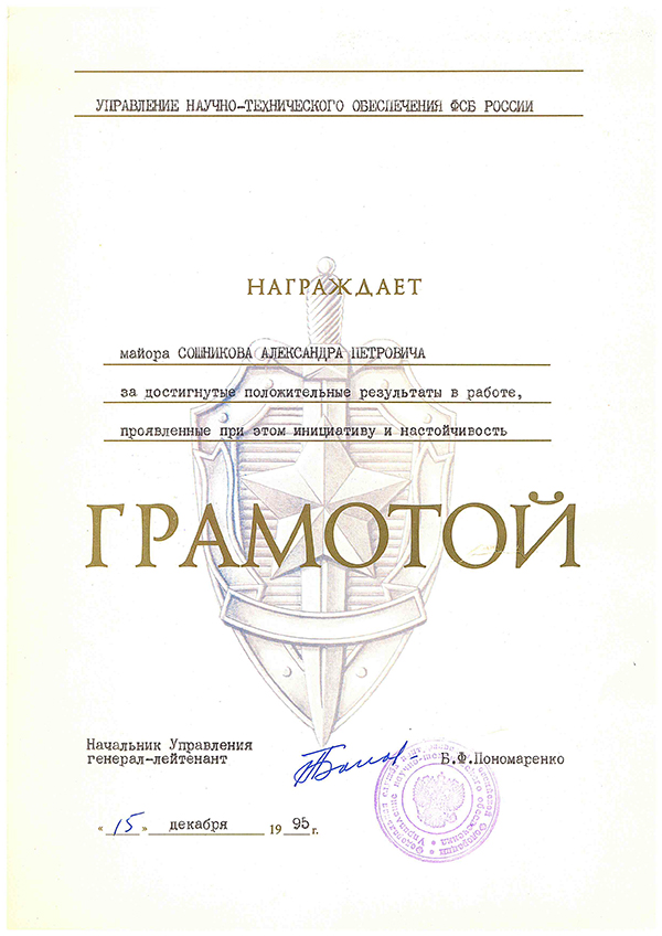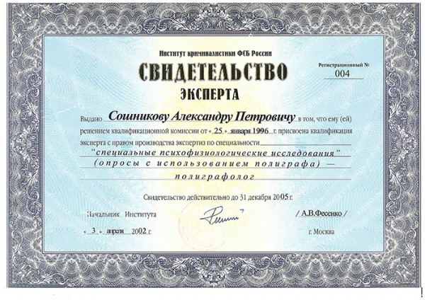 - Свидетельство эксперта Института криминалистики ФСБ России о присвоении квалификации эксперта с правом производства экспертиз по специальности «Специальные психофизиологические исследования» (опросы с использованием полиграфа) — полиграфолог, № 004 от 25.01.1996 г.