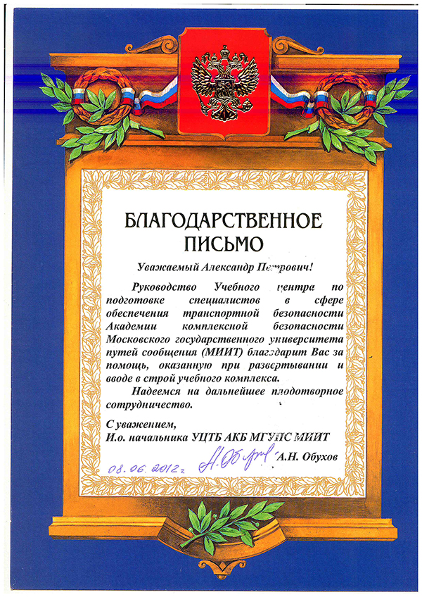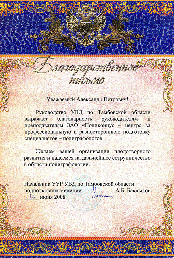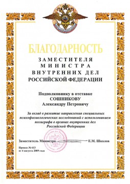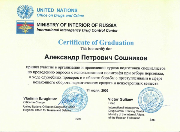 - Свидетельство о повышении квалификации Московской академии комплексной безопасности по курсу: «Основы управления персоналом (с применением полиграфа)» № ДАР- 96К от 2 июля 2005г.