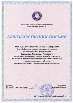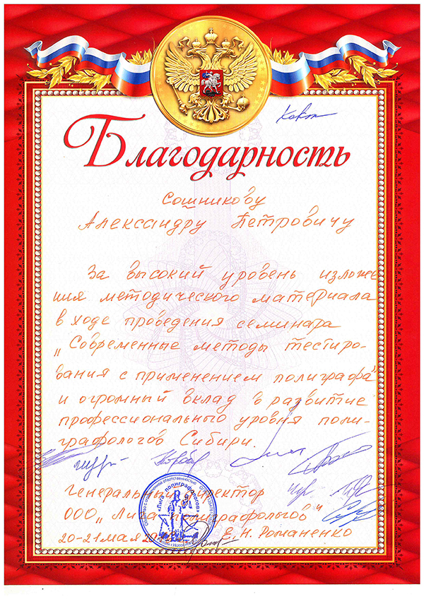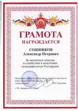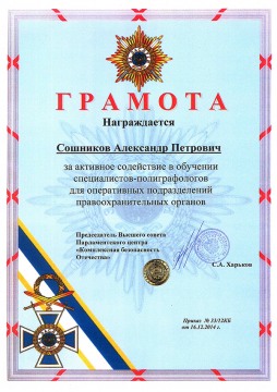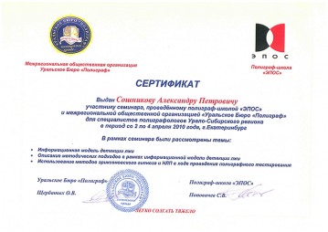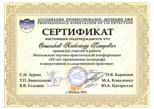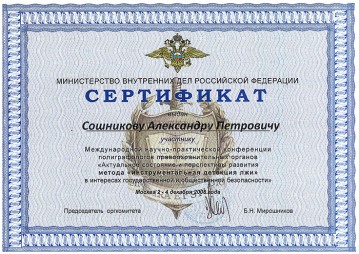 - Удостоверение о повышении квалификации АНО ДПО «ЦПП» в рамках 14 ежегодного семинара по теме: «Основные методические принципы современных технологий тестирования на полиграфе» с 10-14 февраля 2020 г.