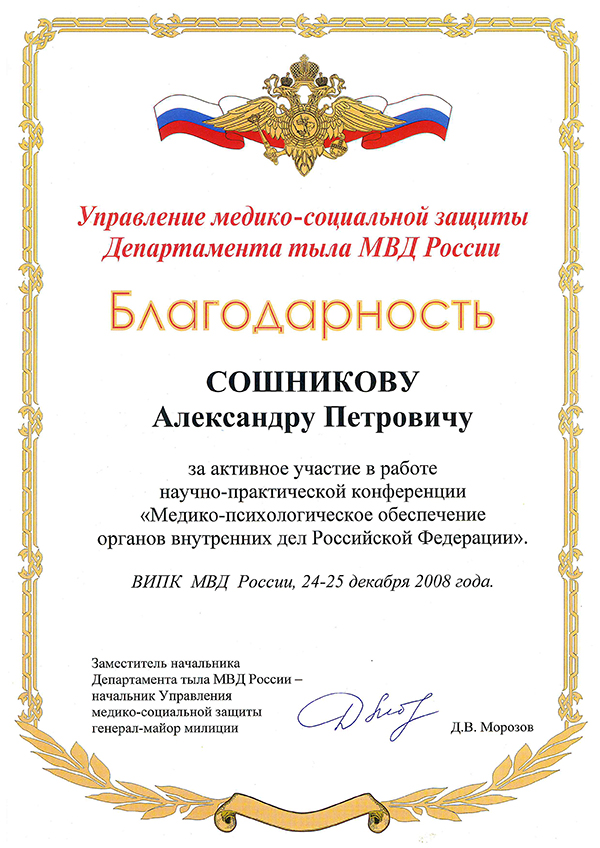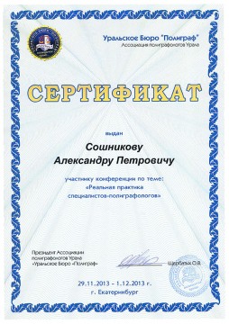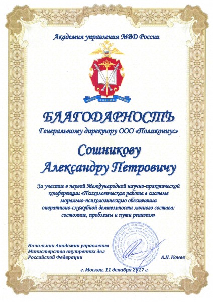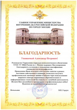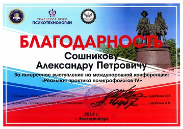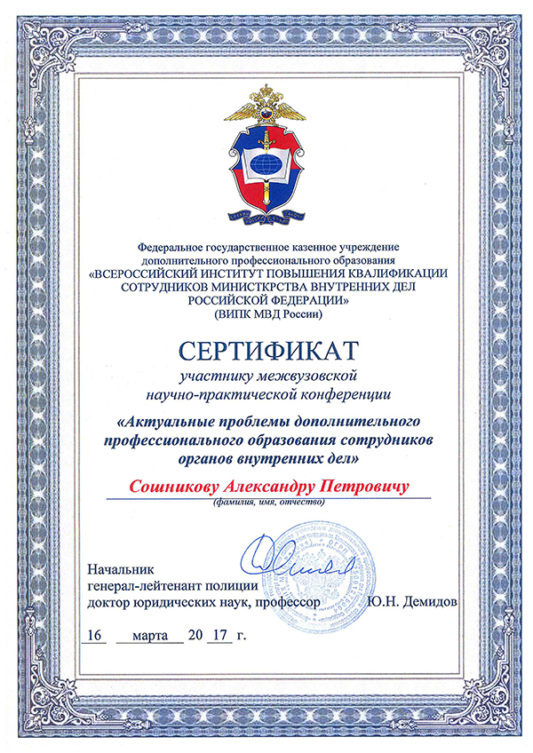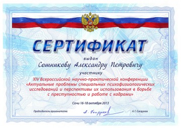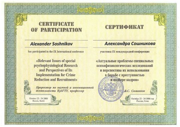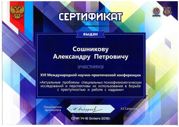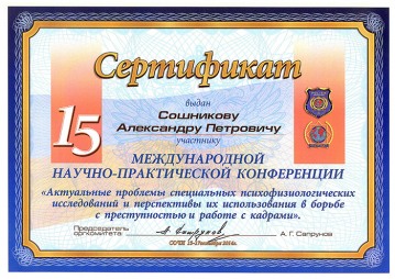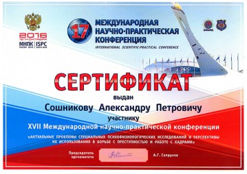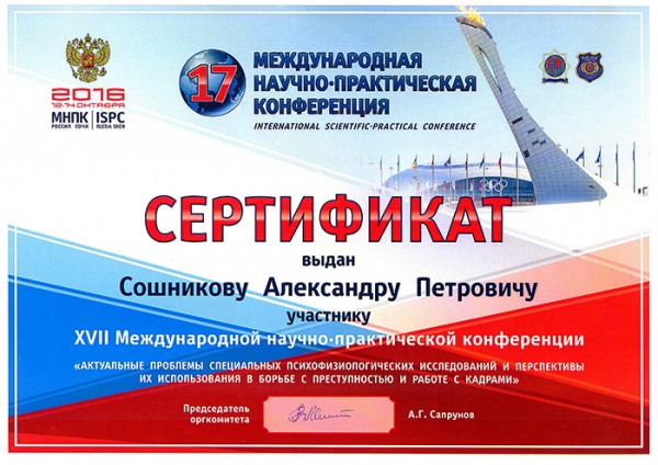 - Сертификат участника 18 Международной научно-практической конференции «Современная практика и перспективы использования специальных психофизиологических исследований в борьбе с преступностью и работе с кадрами» 13 октября 2017г.