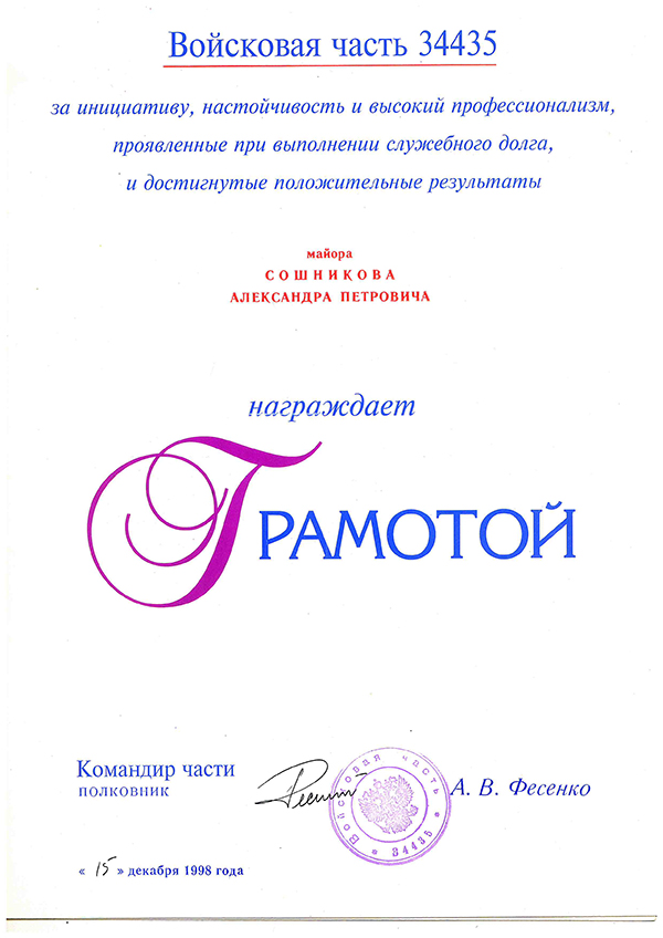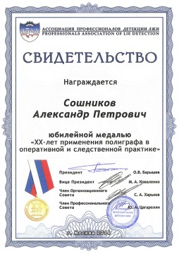 - Свидетельство Агентства экономической безопасности и управления рисками Торгово-промышленной палаты РФ (РАЭБ ТПП РФ) о присвоении квалификации специалиста по опросам с использованием полиграфа (полиграфолога), № 1 от 23.03.1998 г.
