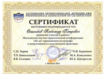 - Сертификат о прохождения обучения в АНО ДПО «ЦПП» по программе: «Комплексная система освоения современных технологий применения полиграфа» с 18-21 апреля 2017г.