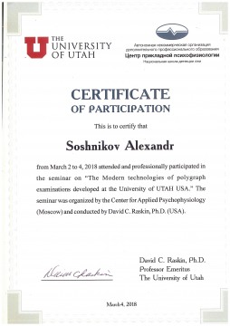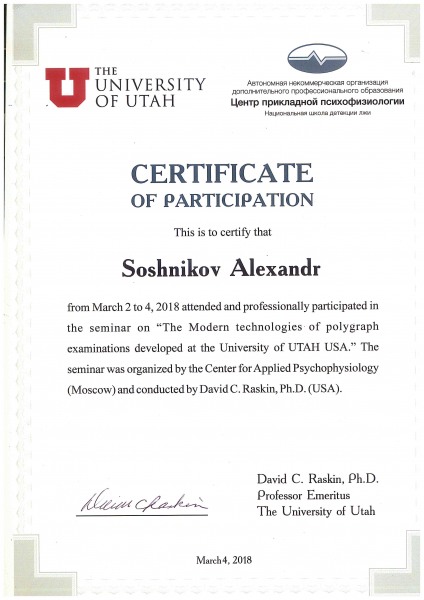 - Сертификат участника 12 ежегодного семинара полиграфологов «Современные технологии применения полиграфа» (модуль 1 и 2), авторский курс Д.Раскина. 27 февраля – 04 марта 2018 г.