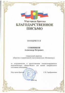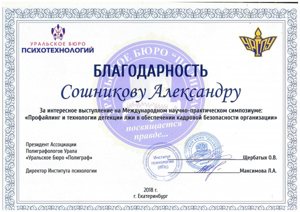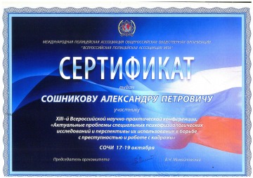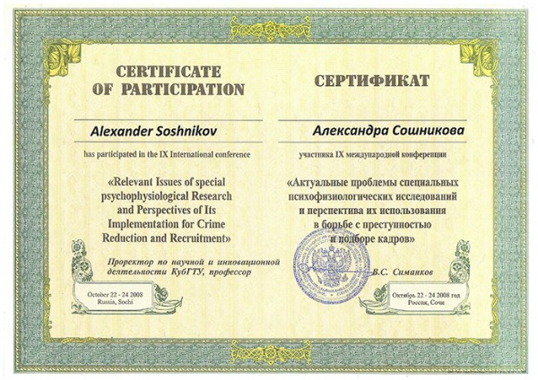 - Сертификат участника 19 международной научно-практической конференции «Современная практика и перспективы использования специальных психофизиологических исследований в борьбе с преступностью и работе с кадрами» 10-12 октября 2018 г.