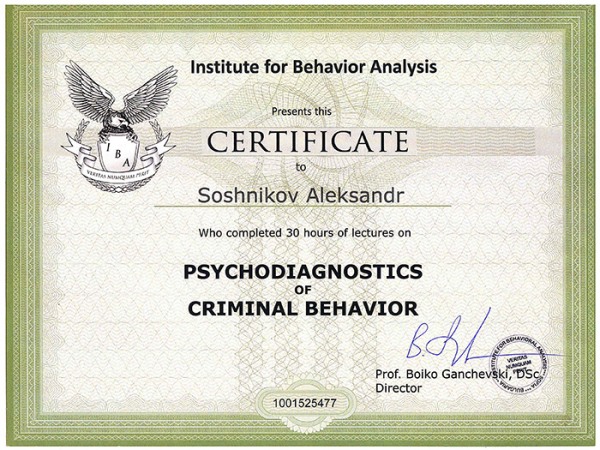 - Completed 30 hours of lectures on «Psychodiagnostics of criminal behavior» conducted by Prof. Boiko Ganchevski, DSc Director. Слушатель 30 часовой курс профессора Бойко Ганчевски на тему «Психодиагностика преступного поведения». Январь 2017 г.