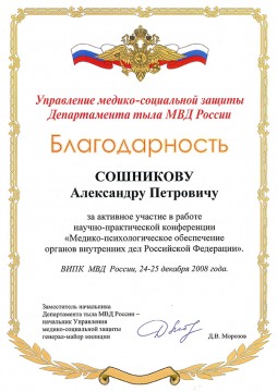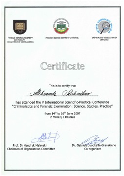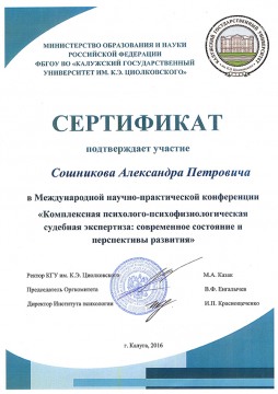 - Сертификат участника Международной научно-практической конференции «Комплексная психолого-психофизиологическая судебная экспертиза: современное состояние и перспективы развития». 2016. Калуга.
