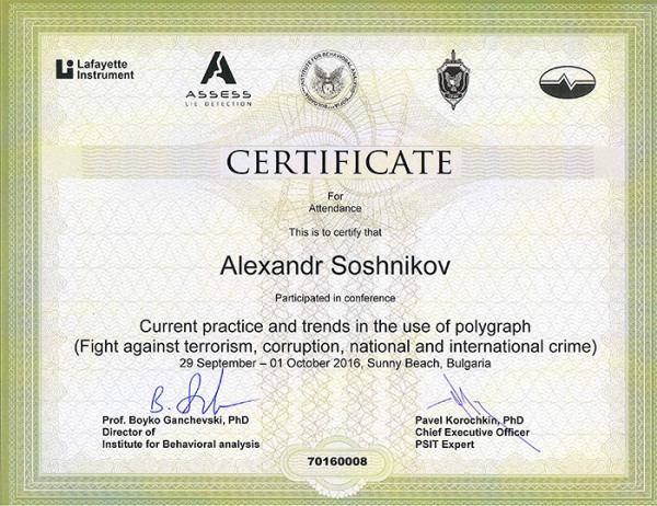 - Certificate for attendance participated in conference Current practice and trends in the use of polygraph (Fight against terrorism, corruption, national and international crime) 29 September -01 October 2016, Bulgaria. Prof. Boyko Ganchevski. Сертификат об участии в конференции текущая практика и тенденции использования полиграфа (борьба с терроризмом, коррупцией, национальной и международной преступностью) 29 сентября -01 октября 2016 года, Болгария. Профессор Бойко Янчевский.