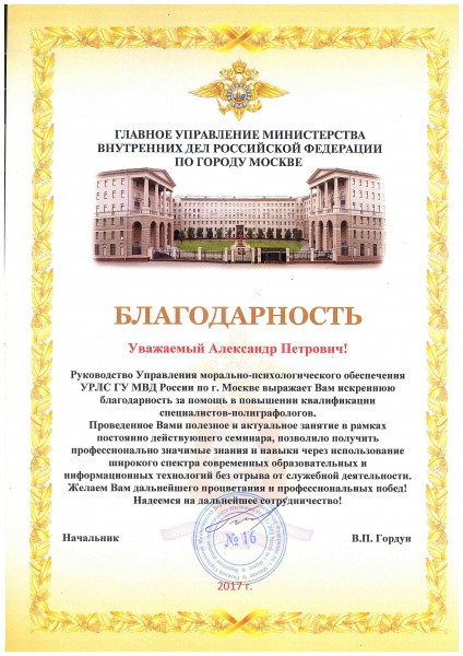 - Сертификат о прохождения обучения в АНО ДПО «ЦПП» по программе: «Приемы и способы противодействия полиграфу. Пути и методика нейтрализации» с 21-22 апреля 2017г.