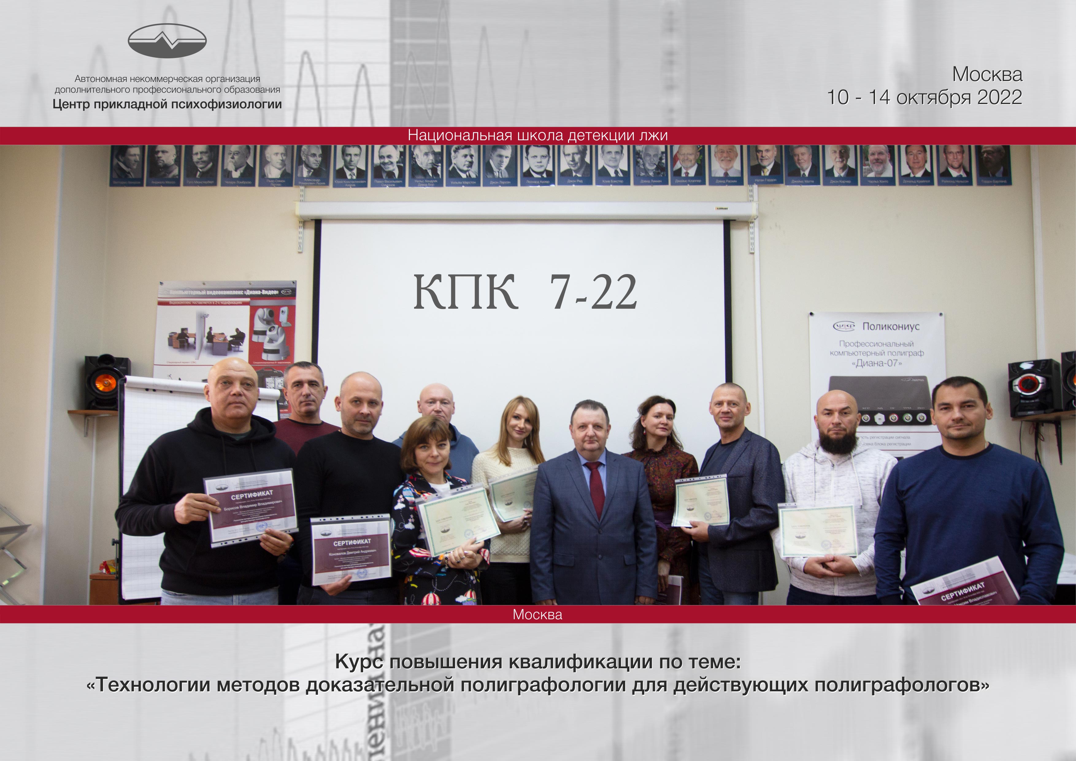 С 10 по 14 октября 2022 года в АНО ДПО «Центр прикладной психофизиологии» (НШДЛ) успешно завершен курс повышения квалификации для полиграфологов по теме: «Технологии методов доказательной полиграфологии для действующих полиграфологов».