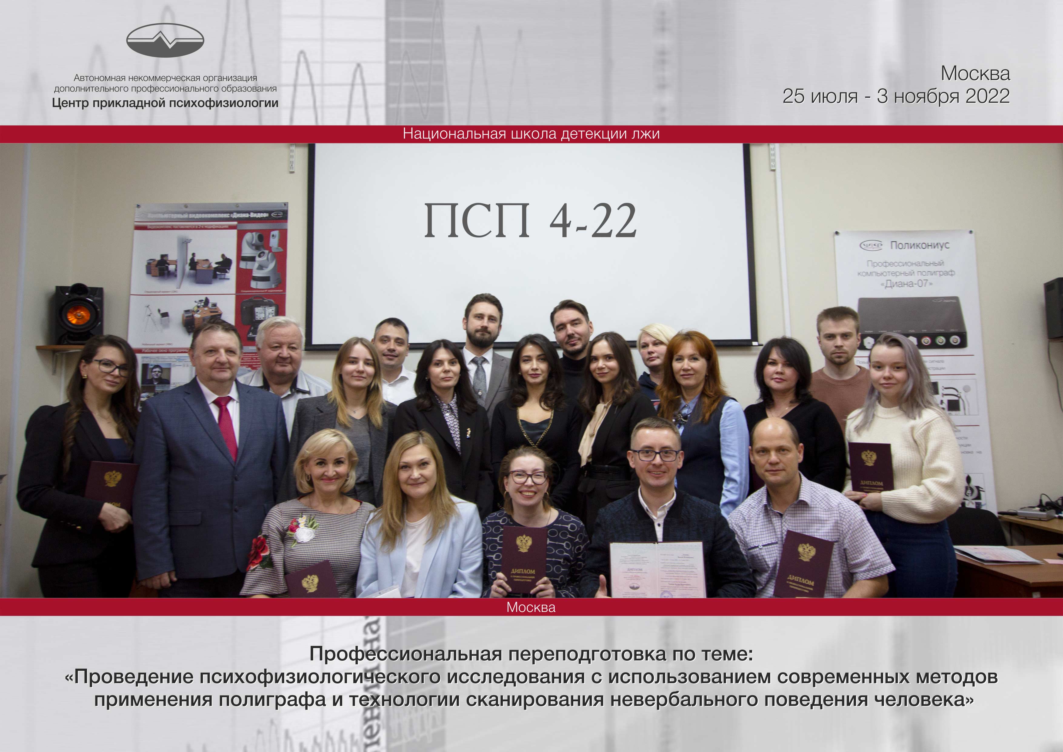 3 ноября 2022 года успешно завершили своё обучение в АНО ДПО «Центр прикладной психофизиологии» (НШДЛ) выпускники группы ПСП 4-22, обучающиеся по программе профессиональной переподготовки «Проведение психофизиологического исследования c использованием современных методов применения полиграфа и технологии сканирования невербального поведения человека».